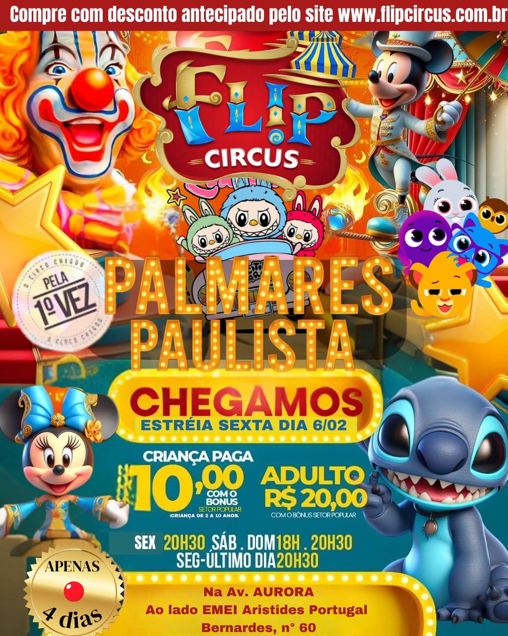 | Ingresso Flip Circus | Palmares Paulista – SP| 07/02/2026 – Sábado 2ª Sessão 20h30min | R$ 11,00 – R$ 27,50Price range: R$ 11,00 through R$ 27,50 → Incluso taxa de compra online |