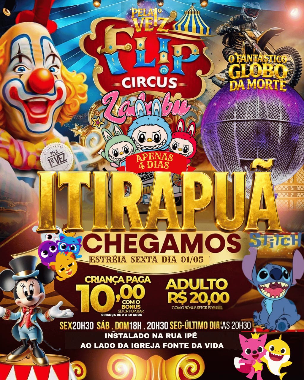| Ingresso Flip Circus | Itirapuã – SP | 01/05/2026 – Sexta-Feira 20h30min | R$ 11,00 – R$ 27,50Price range: R$ 11,00 through R$ 27,50 → Incluso taxa de compra online |