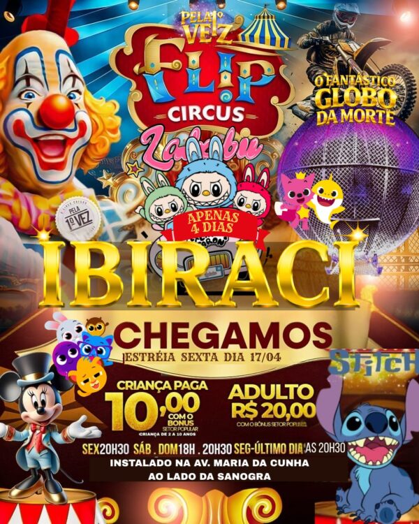 | Ingresso Flip Circus | Itirapuã – SP | 02/05/2026 – Sábado 1ª Sessão 18:00hs | R$ 11,00 – R$ 27,50Price range: R$ 11,00 through R$ 27,50 → Incluso taxa de compra online |